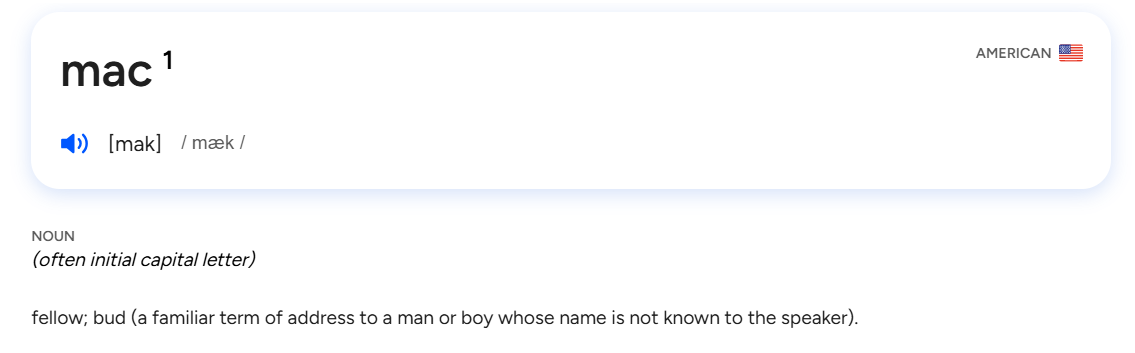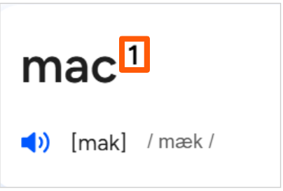 If someone tells you they just ate a delicious “barbecue and mac” taco, and you look up mac, the first entry you find will be for a familiar form of address to a man or boy (e.g. “Hey, mac, can ya gimme a hand here”). That’s not the meaning of mac that you are looking for. But if you look carefully, ‘mac’ has a little superscripted 1 right after the headword and before the pronunciation. When you see this, you know that you are looking at the first (1) of several homographs, and you can keep scrolling to find more.