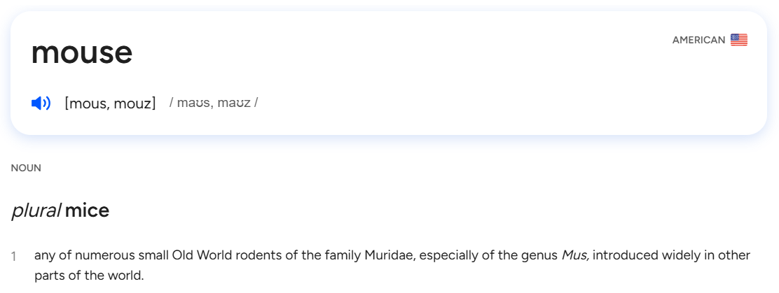 However, the singular noun “mouse” has the unpredictable plural “mice.” Irregularities like this will be shown immediately after the part of speech.